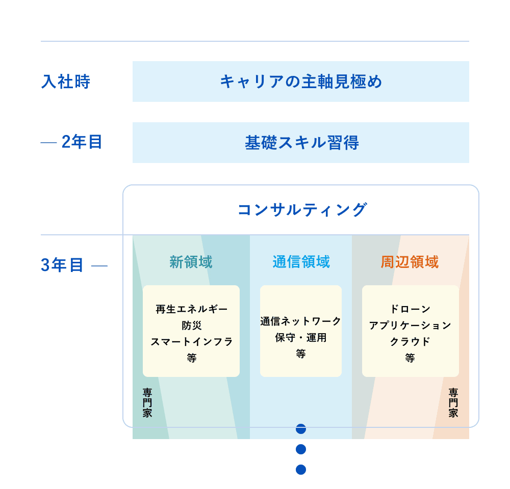 - 通信領域を基盤に、周辺領域・新領域も含めた複合的なスキル習得と各分野の専門家育成を行います。コンサルティングスキルは、全分野で継続してスキルアップを図ります。