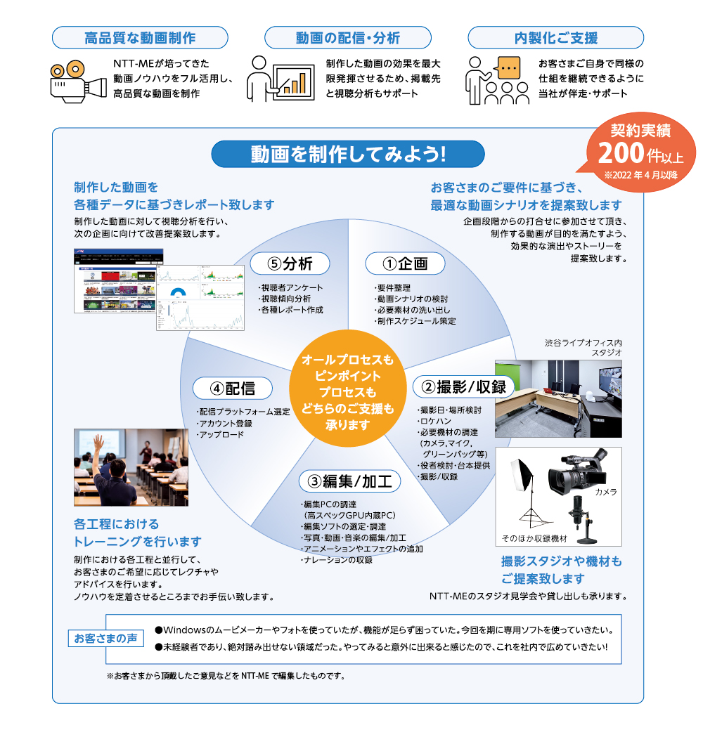 私たちNTT-MEは、各地の多様な案件実績と社内での映像活用DX経験を活かして、お客様のさまざまなお悩みに寄り添ったご提案とご支援をワンストップでご提供いたします。