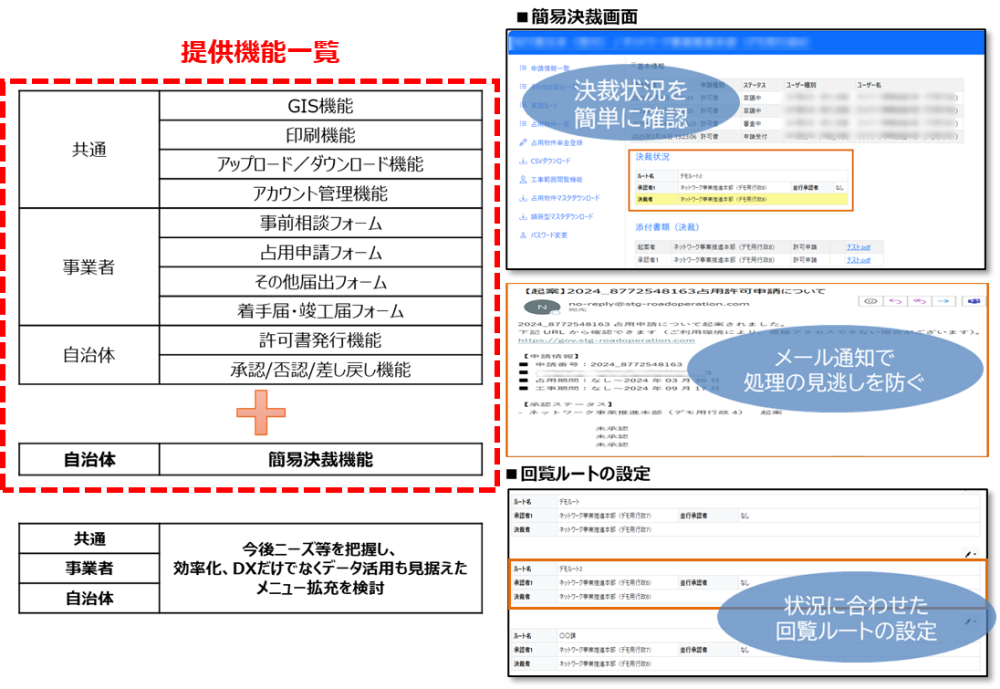 簡易決裁機能により、紙やメールで行っていた回覧・承認プロセスを電子化。担当者間の確認・承認がオンライン上で完結し、申請処理の迅速化、対応漏れの防止、履歴の自動保存による監査対応力の向上など、業務のスピードと透明性が大幅に向上します。さらに、申請~許可書発行、進捗管理までをフロースルーで実施でき、地図機能による工事情報の管理も可能。申請許可情報もWEB上で一元管理できます。